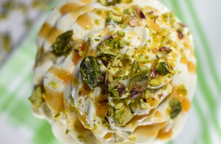 Garnish with whipped cream, crushed pistachios, and a drizzle of salted caramel sauce.