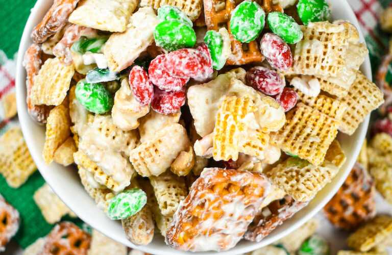 A festive Christmas Chex mix recipe made with corn and rice cereal, pretzels, white chocolate, nuts, and holiday candy.
