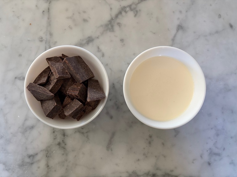 Here, I’m sticking to the basics: just dark chocolate and whipping cream. I first learned this classic two-ingredient ganache preparation (made by pouring warm cream over finely chopped chocolate couverture and whisking until smooth and glossy) during my chocolatier studies at Ecole Chocolat, and later refined my technique while studying at Le Cordon Bleu.