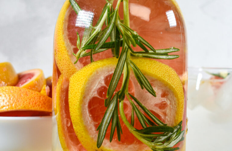 To make grapefruit infused water, start by washing and thinly slicing a ripe grapefruit. Place the slices the bottom of a large jug or pitcher, along with springs of fresh rosemary, then add still or sparkling water. Refrigerate and allow the flavors to infuse for at least 30 minutes (I like to infuse mine for 1-2 hours for a stronger flavor) then serve over ice, along with additional sprigs of rosemary and/or slices of fresh grapefruit.