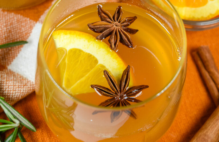 To make it, simply pour a bottle of white wine (the cheap stuff is fine!) into a large stock pot, add whole spices, citrus, and honey, and simmer everything on the stovetop. Then, just strain to remove the spices, throw in a splash of your favorite liquor, and serve.