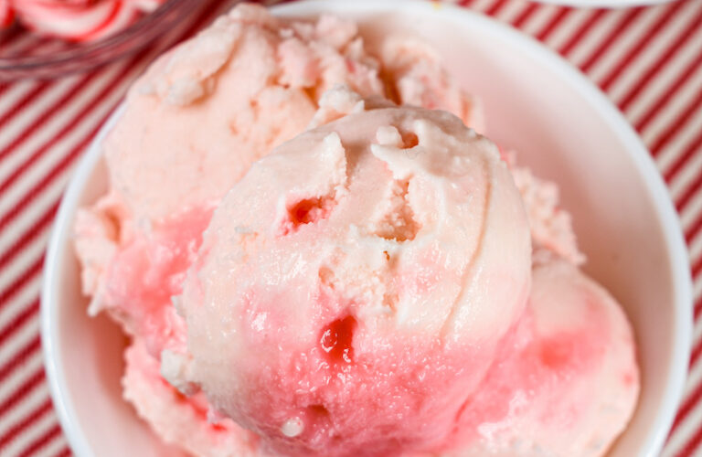 In this recipe, I’ve flavored a traditional whole milk and heavy cream base with natural peppermint oil, added a drop of pink gel food coloring for visual appeal, and stirred in pieces of finely crushed peppermint for that signature candy cane crunch. It’s the perfect homemade peppermint ice cream for Christmas entertaining, although I love sneaking a scoop in the summer, too!