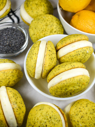 lemon poppyseed whoopie pies recipe featuring a pair of soft, lemon poppyseed cakes and a homemade lemon buttercream filling.