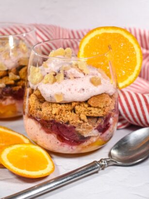 Layers of cranberry sauce, fresh oranges, and cranberry mousse come together in this easy winter dessert.