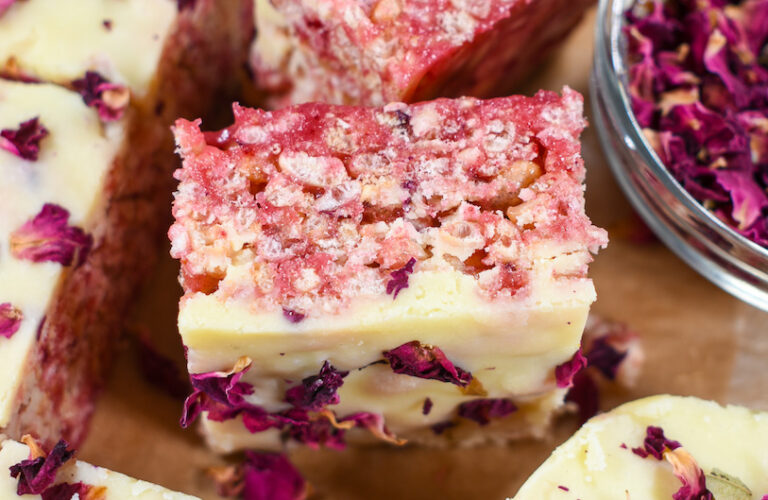 Made with rose petals, rosewater, raspberries, and homemade rose marshmallows, plus a layer of creamy white chocolate slathered ganache on top, this rose and raspberry Rice Krispie treats recipe makes my all-time favorite pink krispie treats. Ideal for Valentine’s Day, pink-themed parties, and other sweet celebrations!