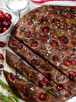 A cranberry focaccia recipe featuring a chocolate focaccia bread dough topped with fresh cranberries, rosemary, chopped dark chocolate, and plenty of olive oil. A fun and festive dessert twist on traditional Italian olive oil bread!! …